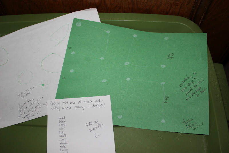 I love our therapists. I cannot rave enough about how much they do for Justin, and really our whole family. One of the things I love about them is they write sweet little notes about what Justin did in therapy. I have a whole collection of really encouraging samples of Justin's accomplishments. Miss Caroline even dates them so I can keep track of everything. Miss Sarah has taken videos of Justin and writes down his new words when he seems to have a word explosion. They are as proud of him as we are. They laugh with him and love his cuddles as much as his mama. I think that is so amazing. As much as I constantly reevaluate our plan for Justin, I know I don't need to waste much time thinking through our decision to keep Justin with his therapists. They are definite keepers!